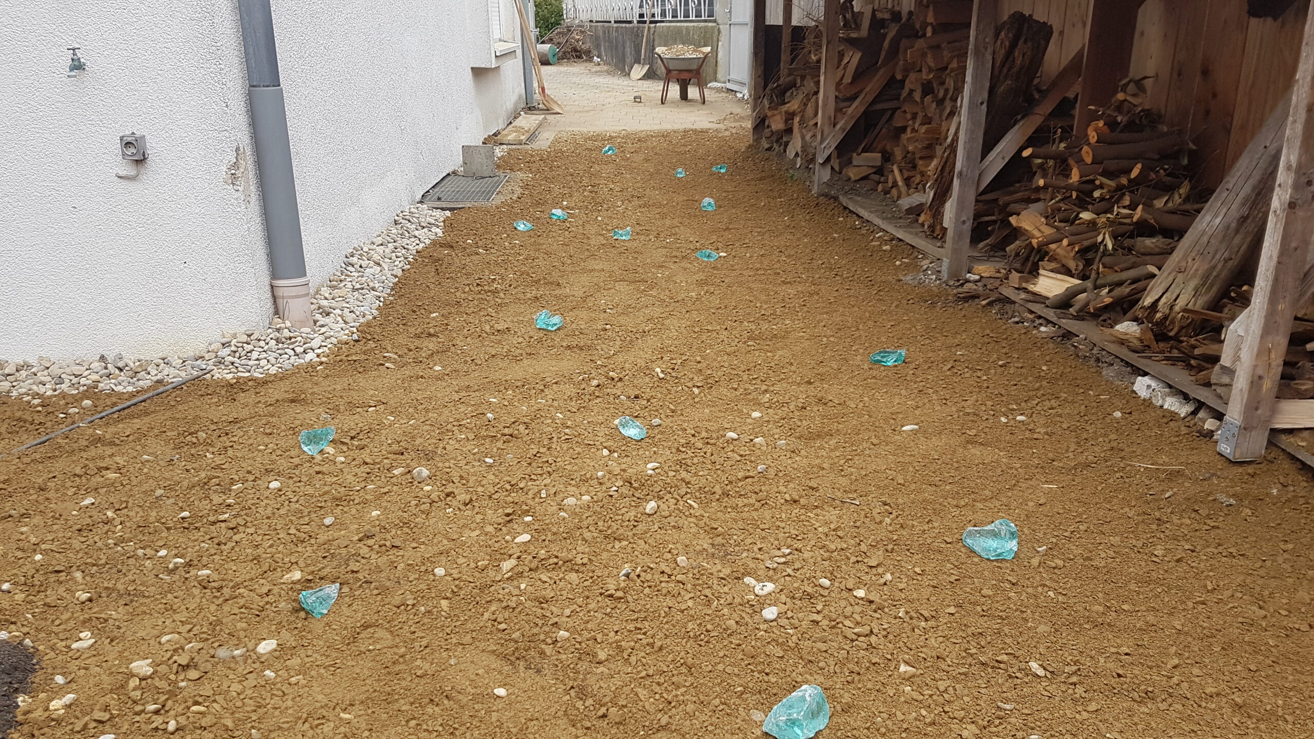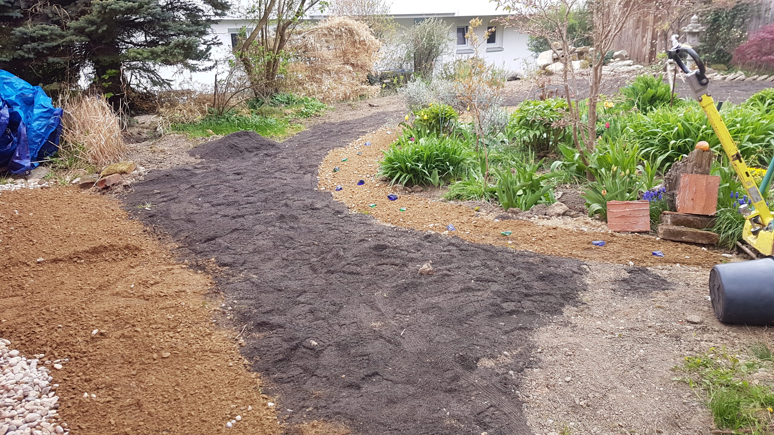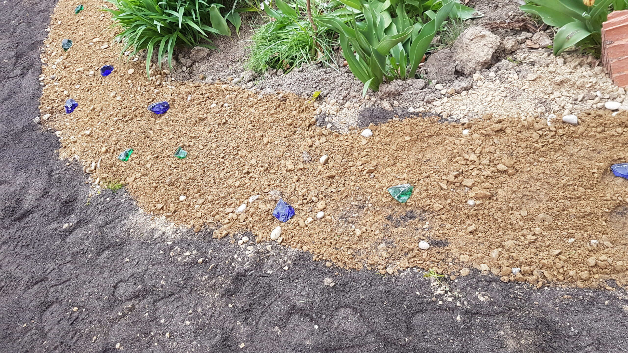 Umgestaltung eines kleinen Privatgartens mit Neupflanzung einer Hecke aus heimischen Gehölzen, angrenzender Blumenwiese und einer wassergebundenen Wegedecke, die durch Farbglas Einschlüsse zu einem besonderen Blickfang wird.