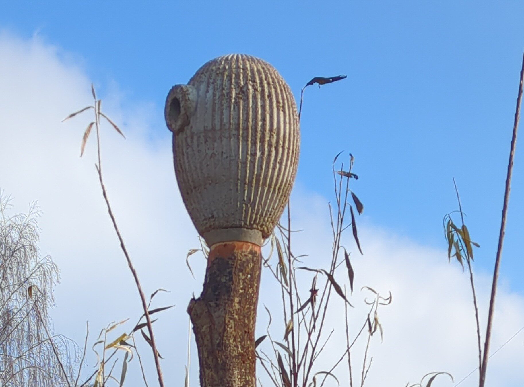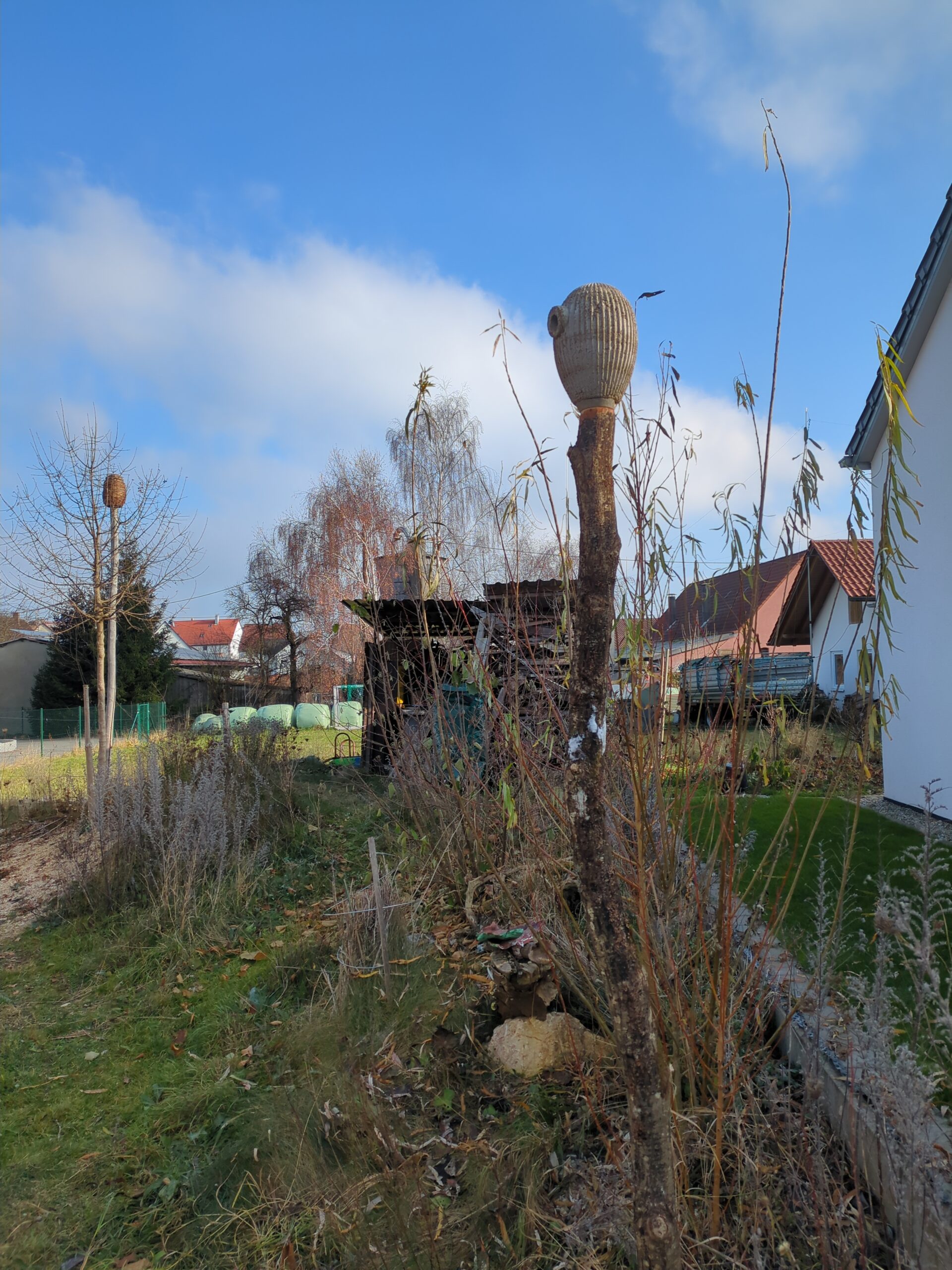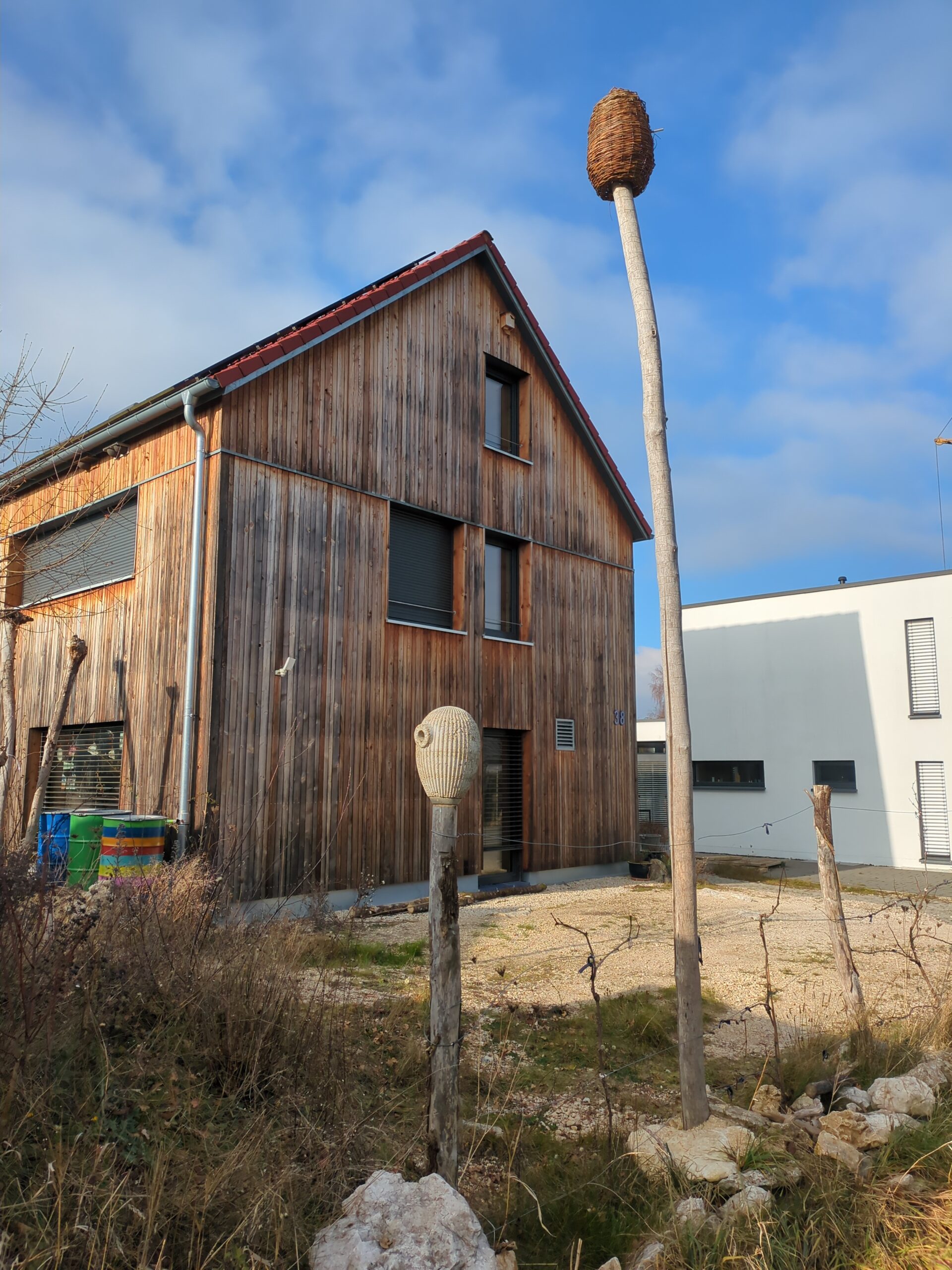 Wir haben uns gefragt, wie man Nistkästen auch ohne Altbestand an Bäumen, in einen Garten integrieren kann. Gerade in Neubaugebieten fehlen oft natürliche Nistmöglichkeiten für Vögel. Nach intensiver Tüftelei entstand ein formschöner Nistkasten aus Holzbeton, der sich flexibel auf ein natürliches Rundholz -beispielsweise aus Robinie- montieren lässt. Holzbeton bietet eine ideale Isolierung gegen Kälte und Hitze, ist atmungsaktiv, sehr robust und langlebig. Wie stellen ihn in unterschiedlichen Farben und auch mit Weide umflochten her.